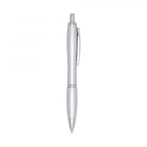 Caneta plástica prata com anel e detalhe emborrachado colorido.