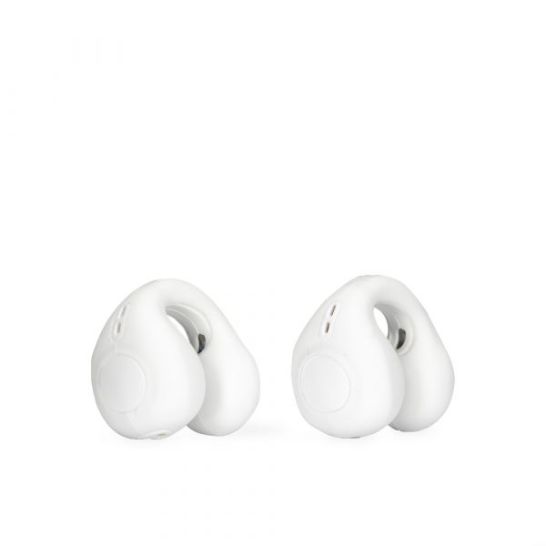 Fones de ouvido sem fio com estrutura leve e confortável feita em plástico. Seu formato ear cuff, semelhante a um par de brincos, permite o encaixe ao redor das orelhas sem entrar em contato com o canal auditivo, ideal para uso prolongado. Sua conexão via Bluetooth 5.3 oferece estabilidade de áudio com menor consumo de energia. Cada fone apresenta um botão multifunções, com comandos por toque para trocar músicas e controlar o volume. Acompanha cabo USB-C para carregamento.