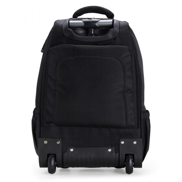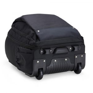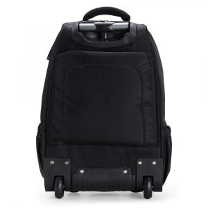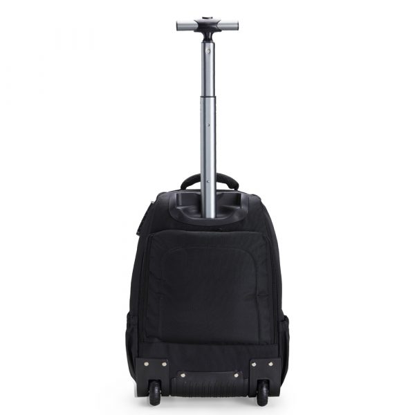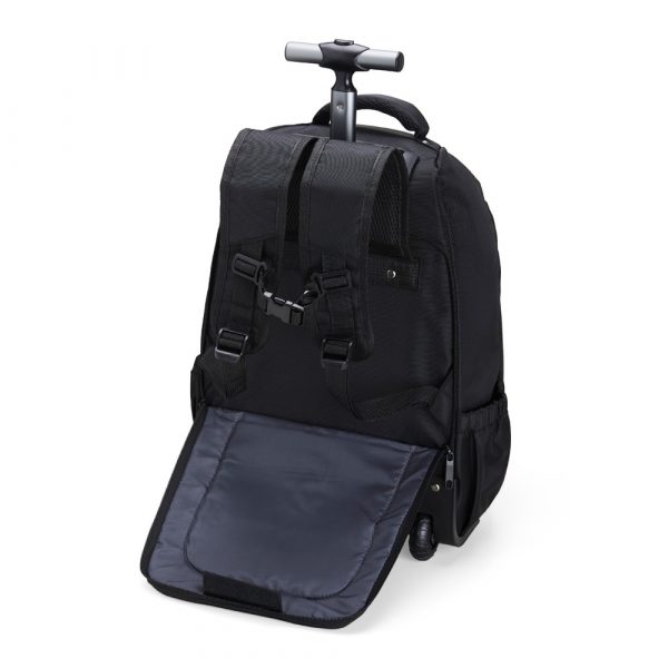 Mochila 27 litros com rodinhas e cadeado TSA. Possui padrão para bagagem de mão, conforme especificações ANAC (Agência Nacional de Aviação Civil) Confeccionada em nylon, contém alça revestida com espuma para um maior conforto, puxador retrátil com regulagem e botão acionador, alças para as costas escondidas no compartimento traseiro com zíper. Com 5 compartimentos, sendo um pequeno para carteira e canetas, dois medianos para documentos, bolsos nas laterais, bolso para notebook até 15,6 polegadas com divisórias para celular e forro com zíper. Possui duas rodinhas e freio em plástico, além de um sistema velcro para junção do compartimento das alças com a parte inferior, tampando as rodinhas enquanto transporta a mochila nas costas.