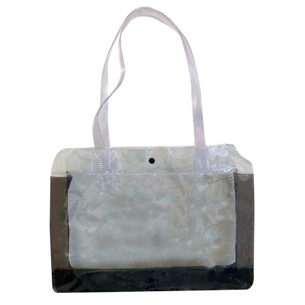 Sacola Transparente fabricada em PVC 0,20 Cristal com Laterais em PVC 0,20 fumê, possui Botão de pressão além de alça Multiúso.